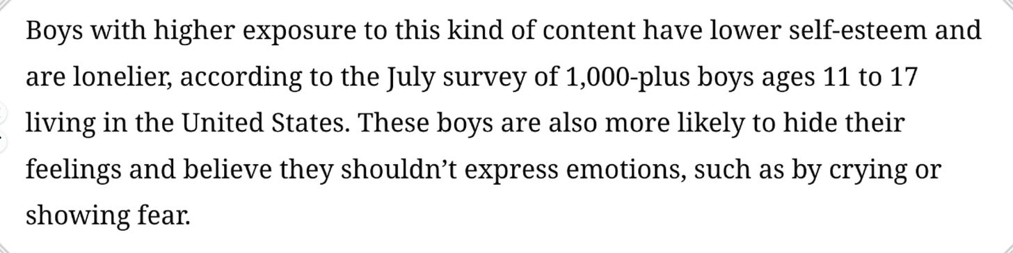 This isn’t social science; it’s social conditioning. The goal is to make boys feel guilty for showing interest in strength, fitness, or ambition—traits that once defined healthy manhood. Curiosity becomes complicity. Click on a video about discipline, and you’re suddenly part of a “radicalization pipeline.” It also sends a message to parents that they need to control their boys online activity or face his loneliness, low self-esteem, and violence.