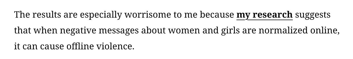 When you follow the link she labels as “my research,” there’s no actual study showing that negative messages about women and girls cause offline violence. The link leads instead to another article summarizing her opinions on the topic. While she refers vaguely to a “wide body of research,” none of the studies she mentions establish a causal connection between online content and real-world violence against women. In fact, the evidence she cites is general research on media violence, not on misogyny or social media behavior.