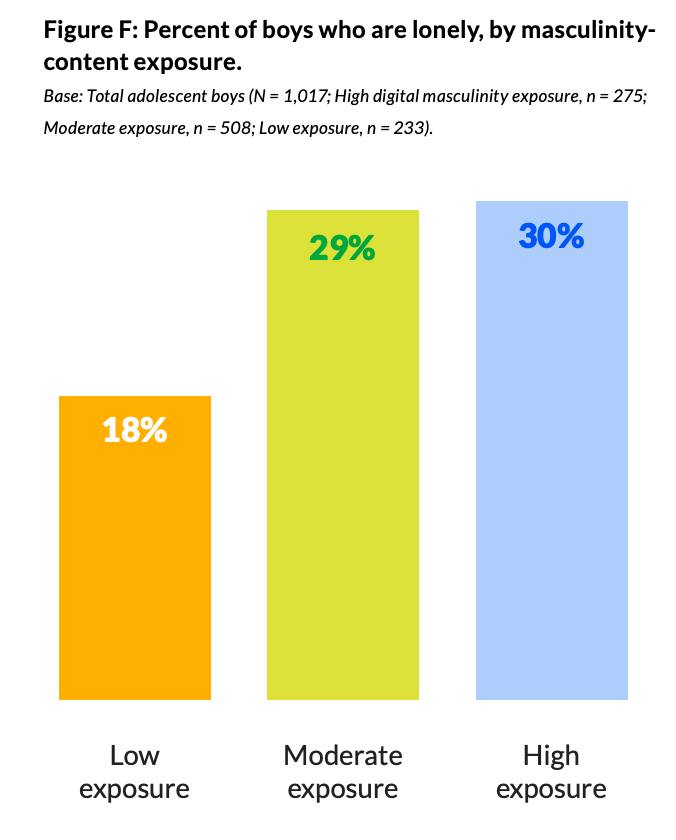 The 2025 report surveyed 1,017 boys ages 11–17 across the U.S., asking about their online habits, exposure to “masculinity-related” content (posts about fighting, fitness, dating, or making money), and indicators of well-being such as self-esteem and loneliness.