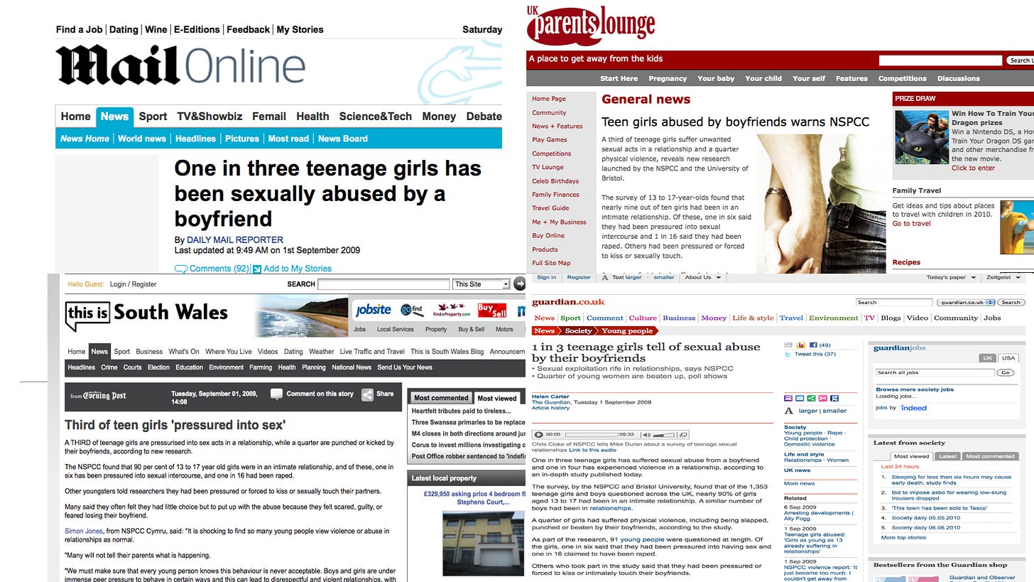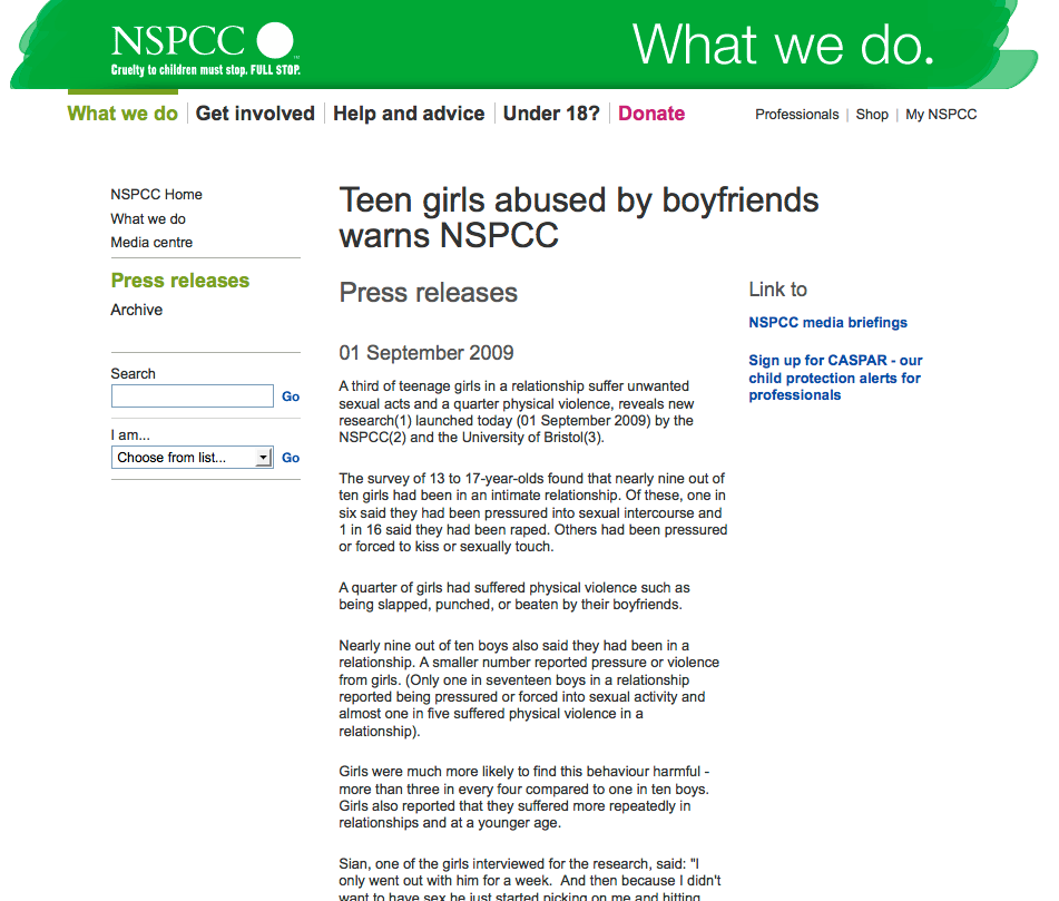 Teen girls abused by boyfriends warns NSPCC Press releases 01 September 2009 A third of teenage girls in a relationship suffer unwanted sexual acts and a quarter physical violence, reveals new research(1) launched today (01 September 2009) by the NSPCC(2) and the University of Bristol(3). The survey of 13 to 17-year-olds found that nearly nine out of ten girls had been in an intimate relationship. Of these, one in six said they had been pressured into sexual intercourse and 1 in 16 said they had been raped. Others had been pressured or forced to kiss or sexually touch. A quarter of girls had suffered physical violence such as being slapped, punched, or beaten by their boyfriends.