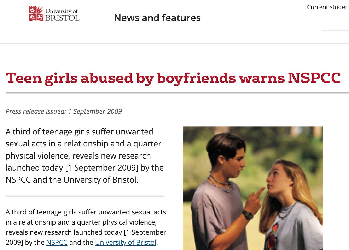 The NSPCC introduced this research to the public through a press release, and once again, we can see the same pattern — a steady move away from acknowledging boys. What began as an apparently balanced investigation into teen relationship violence in the full report became less so in the executive summary, and by the time it reached the press release, the focus had shifted almost entirely to girls. Here’s the opening of that release. Note the “girls only” framing in both the headline and the opening paragraphs: