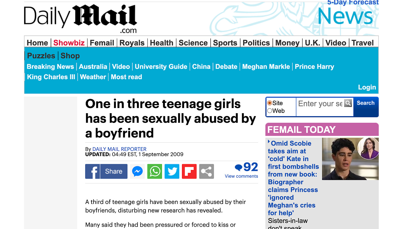 It now seems easy to understand how the media articles focused so exclusively on girls and ignored the needs of boys. They likely only read the press release and maybe a part of the executive summary. The press release might very well have been the only document they read about the study and it clearly focused almost exclusively on girls while ignoring the needs of boys. How bad did it get in focusing on just girls? Here is a sampling of typical headlines from actual news articles on this research and ad campaign: Many Girls’ Abused by Boyfriends