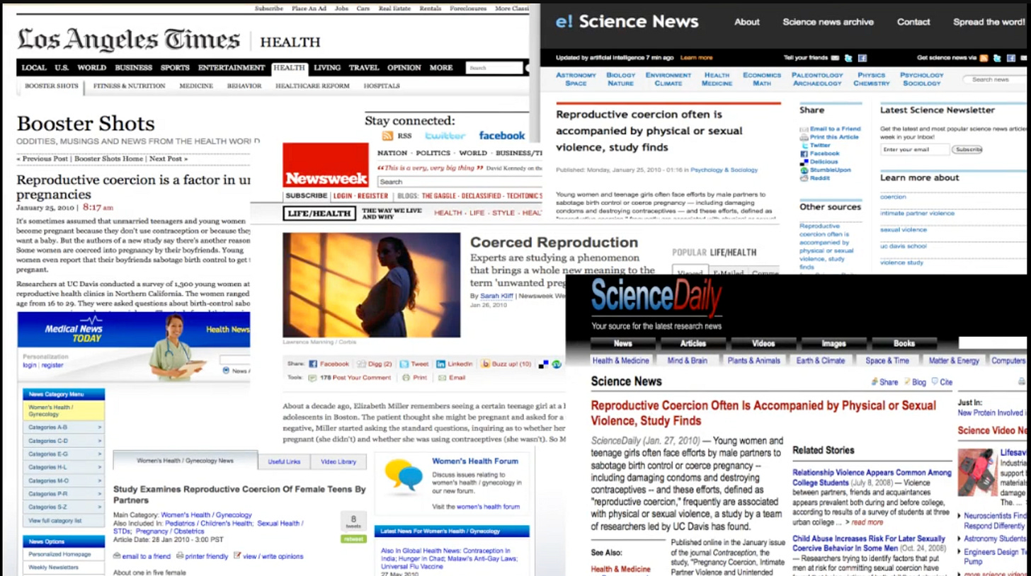 What do these quotes and headlines have in common? They all sound as if the study in question applies to the general population of men and women, boys and girls. The circulation of Newsweek is 2.7 million so just from that source alone a great many people have been given the impression that men in general will tend to coerce women in general to get pregnant.