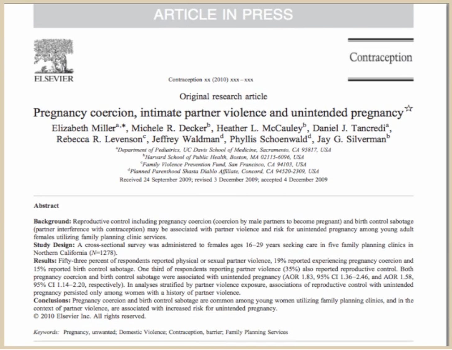 There is a new study which discusses a horribly prevalent but rarely discussed form of intimate partner violence: reproductive coercion.